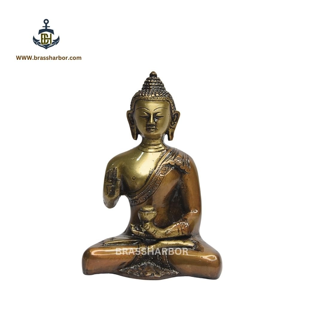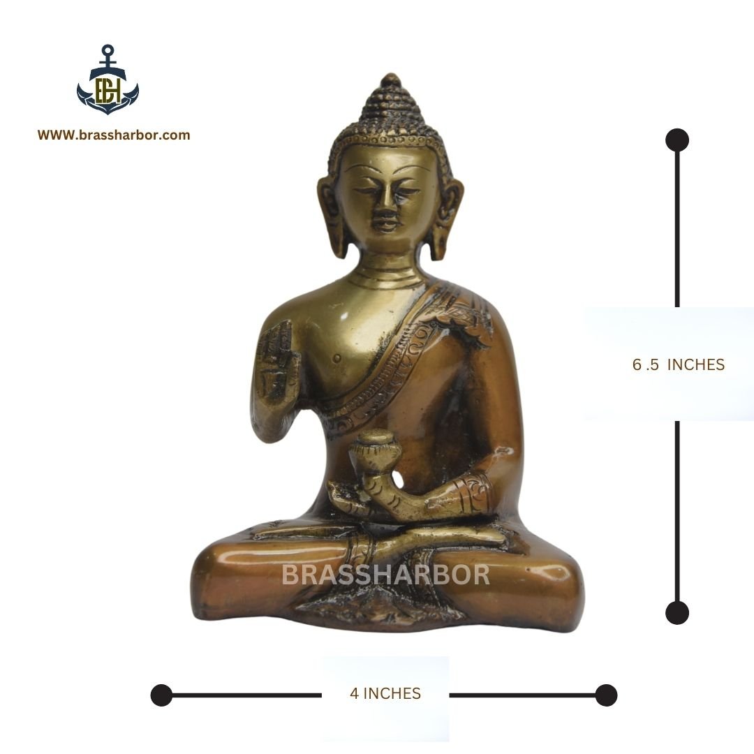 Meticulously crafted from high-quality brass, this statue captures the intricate details and serene expression of the Buddha, showcasing the artisan’s dedication to creating a timeless piece. The warm golden hue of the brass adds an elegant touch to any decor, ensuring that it stands out as a focal point in your living space. Whether placed on a shelf, altar, or desk, the idol serves as a constant reminder to seek inner peace and tranquility.